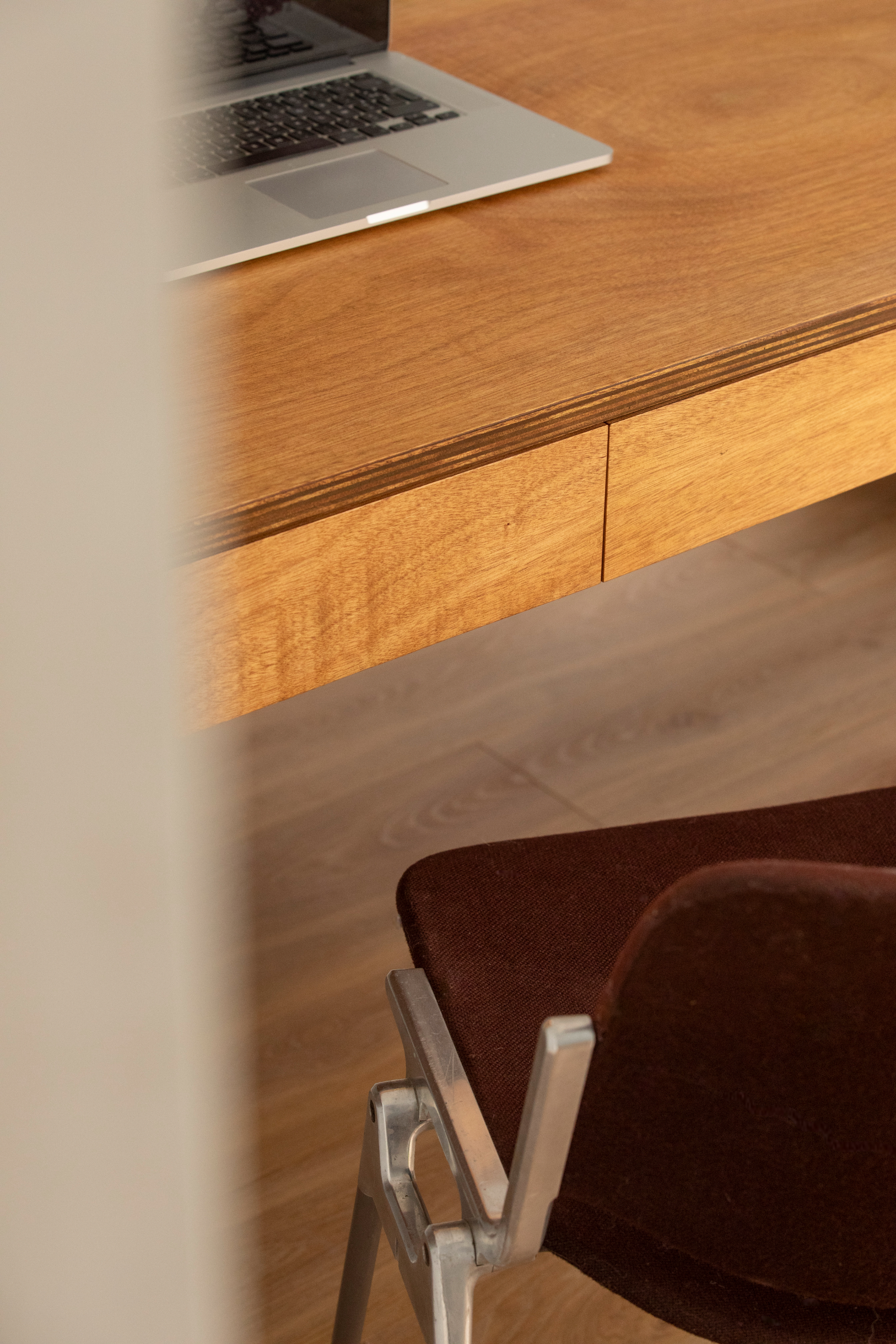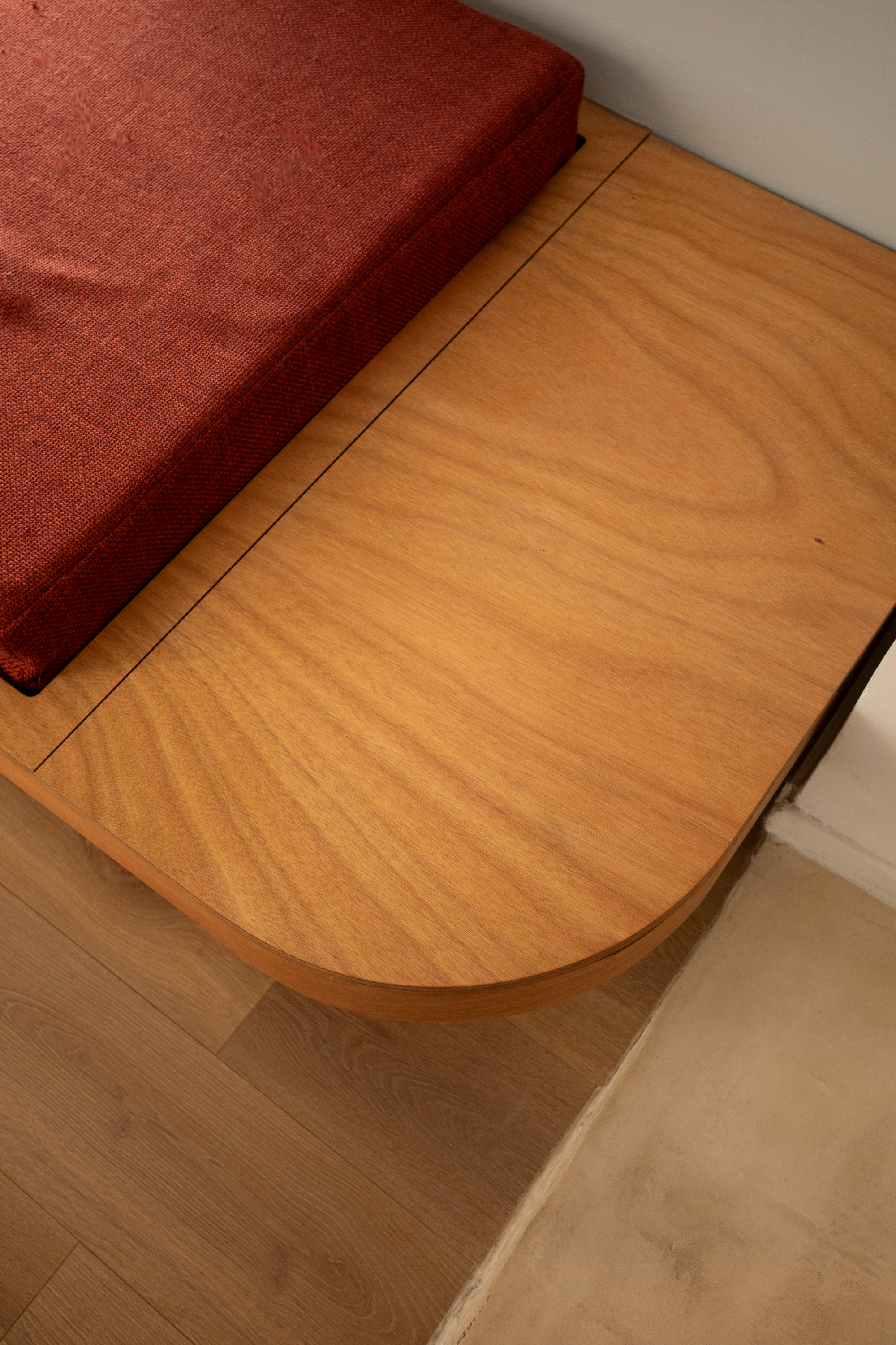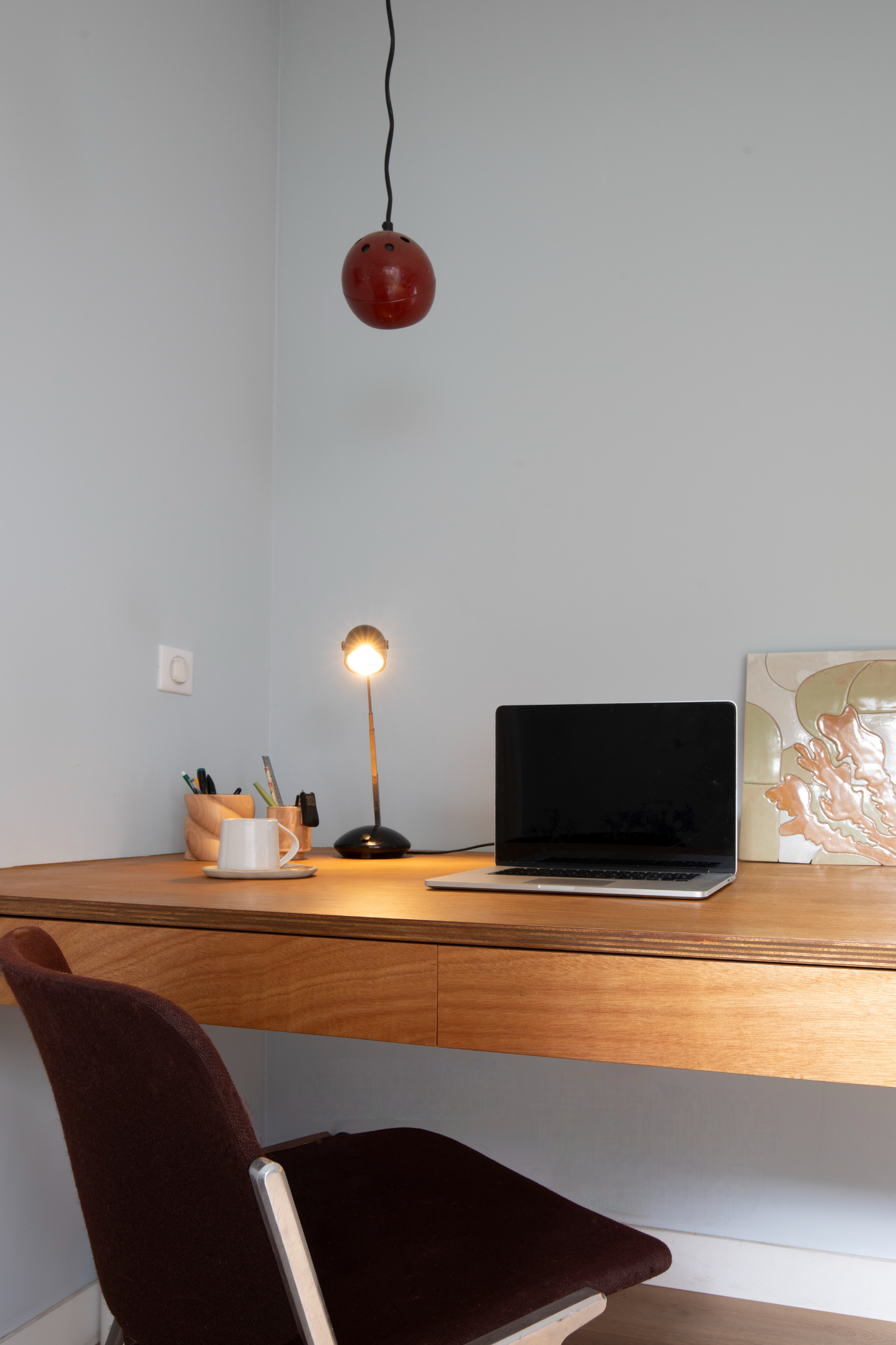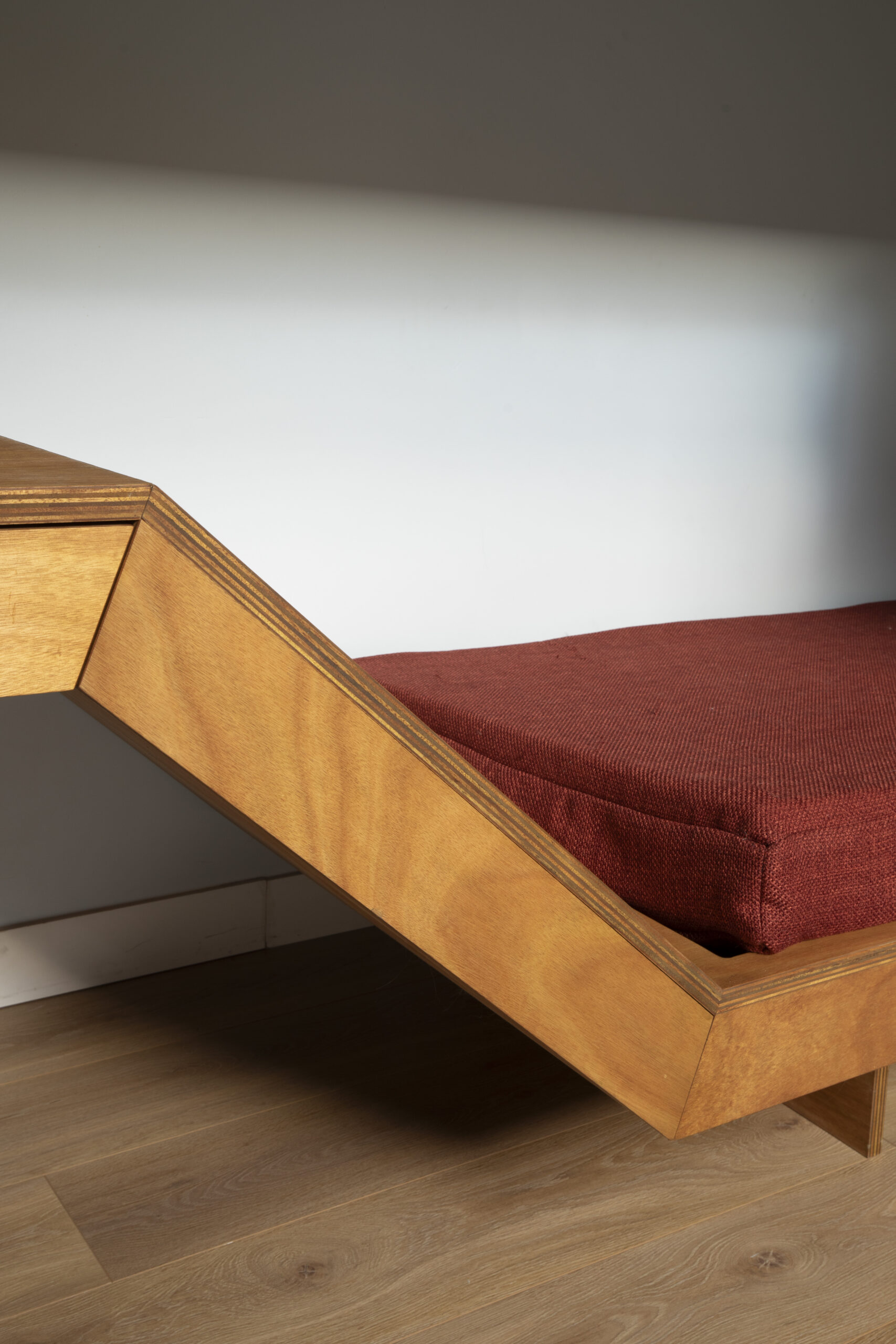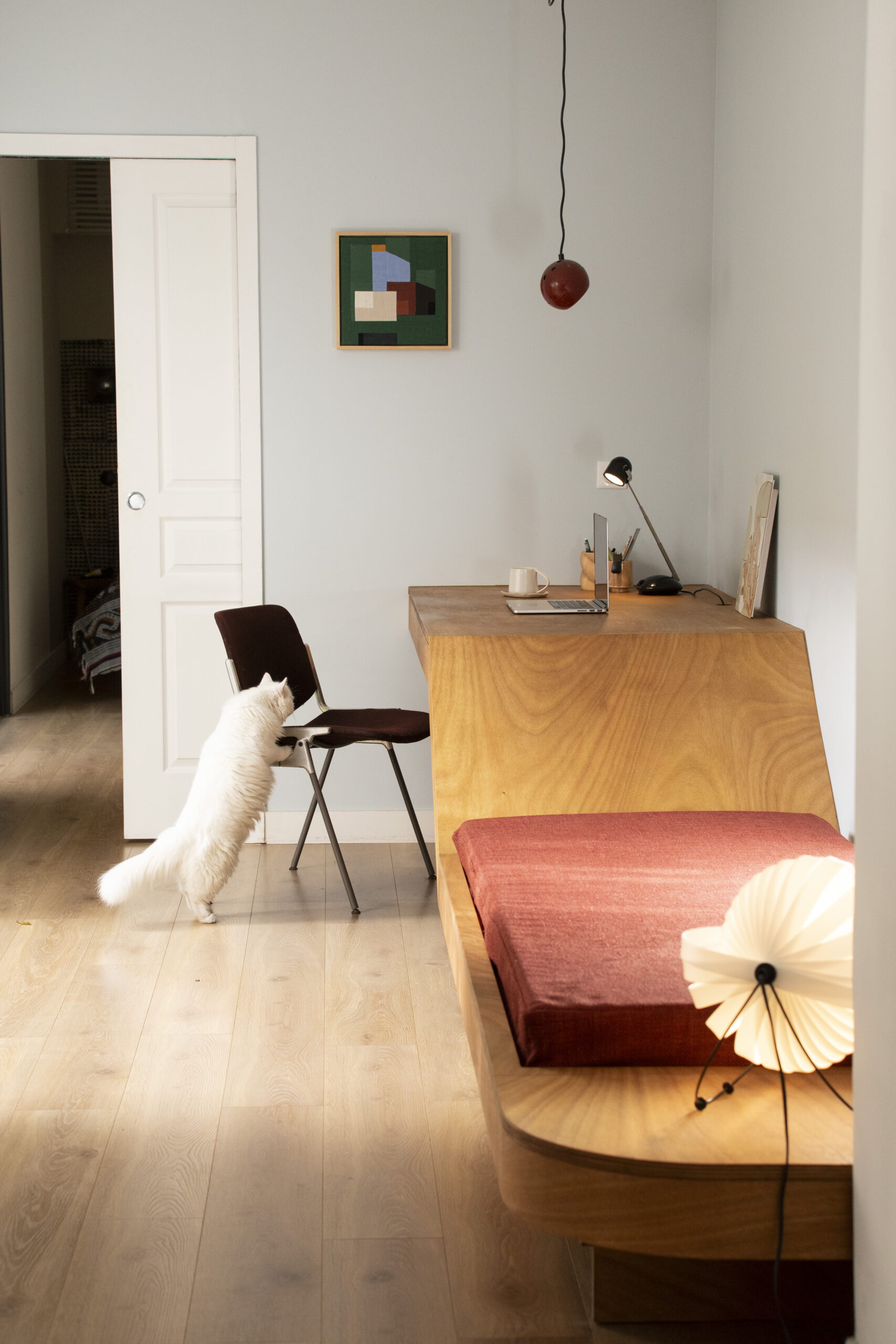 Imaginer un espace pour travailler et se prélasser, telle était la demande de Dorothée et Simon. Pour cette pièce étroite et baignée de lumière, nous avons choisi d’épouser toute la longueur du mur d’un seul trait : à gauche un grand bureau confortable et dans le prolongement de sa pente douce, une banquette accueillante. À son extrémité, une tablette pour une lampe à poser et un coffre secret pour les babioles à cacher!